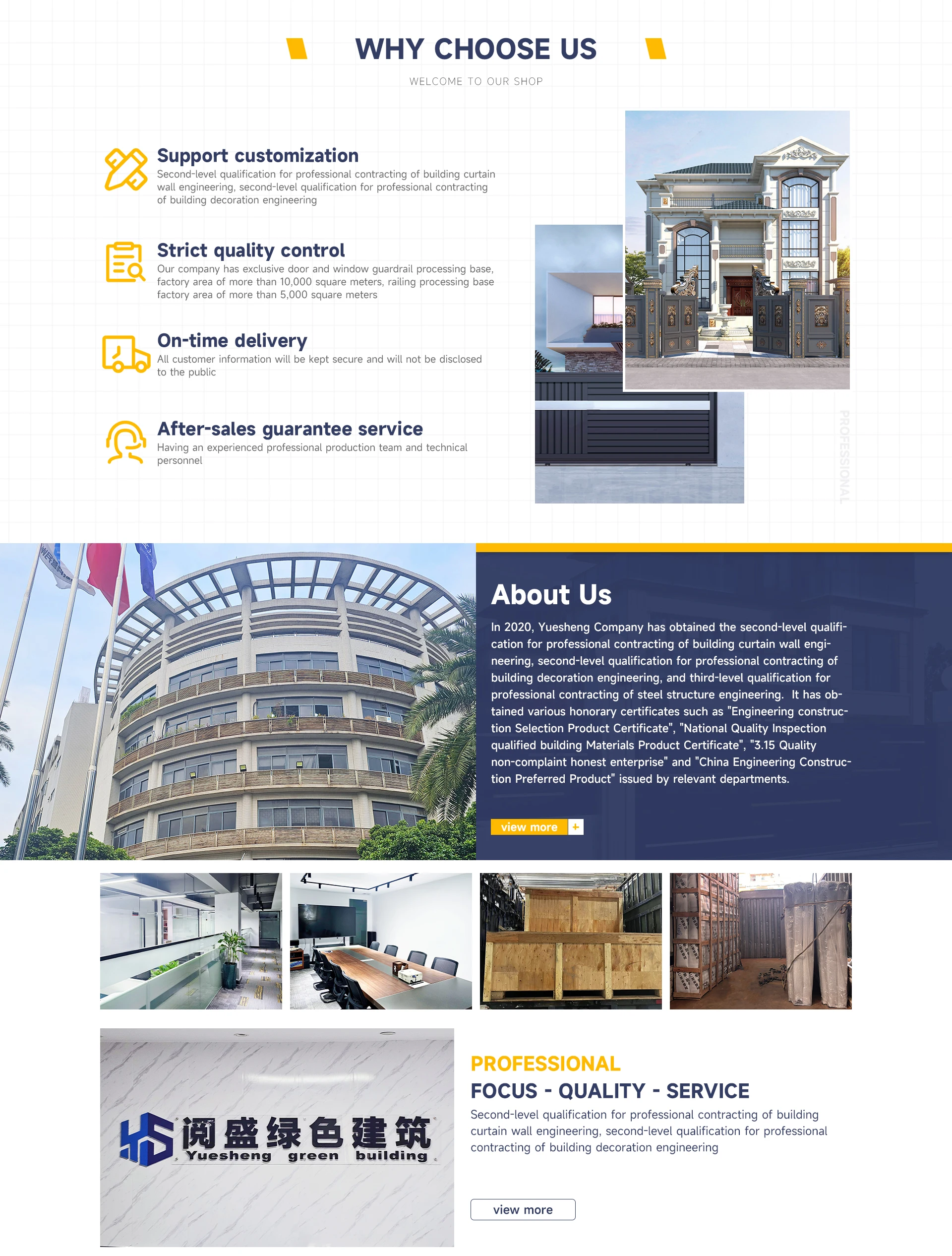Productos principales:Puertas y ventanas de aleación de aluminio, Muro cortina de vidrio, Estanterías metálicas, Puerta de patio, Barandilla